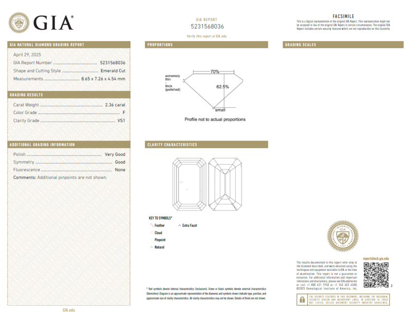 GIA, 2025, Report No. 5231568036, 2.36 carats, F color, VS1 clarity, No fluorescence
