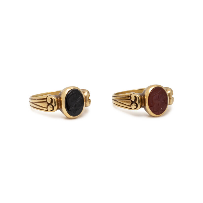 One ring set with a black onyx intaglio measuring approximately 9.35 x 7.10 mm and the other set with a carnelian intaglio measuring approximately 9.45 x 7.60 mm, both intaglios depicting a warrior in profile. Mounted in 18 karat yellow gold. Rings size 7.