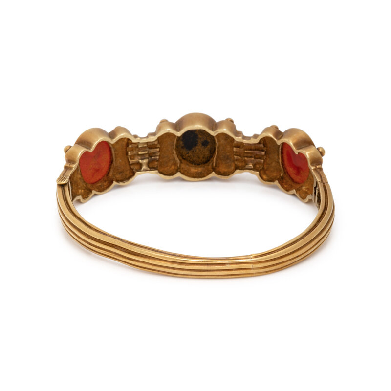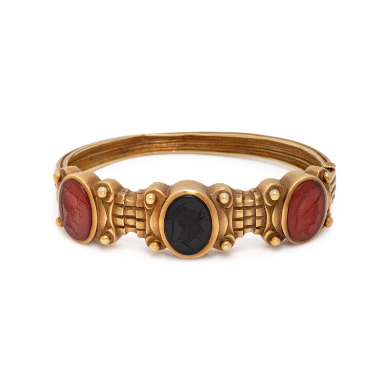 In Greco-Roman style with three intaglios depicting warriors in black onyx and carnelian, hinged with side clasp. Mounted in 18 karat yellow gold. 7 1/4 inches inner circumference.