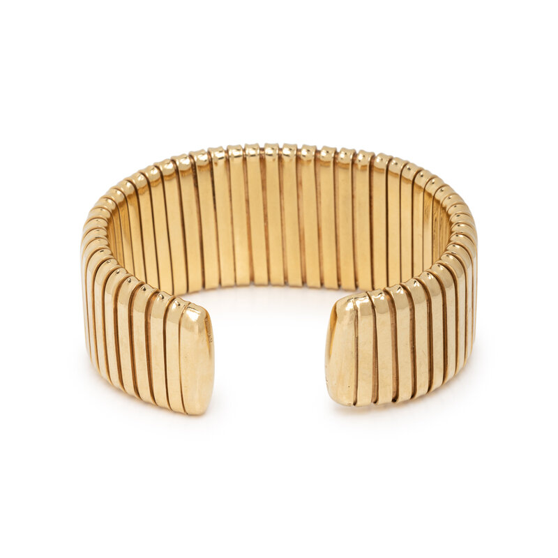 The wide tapering tubogas flexible cuff measuring approximately 20.00 - 30.00 mm. 18 karat yellow gold. 6 1/4 inches inner circumference.