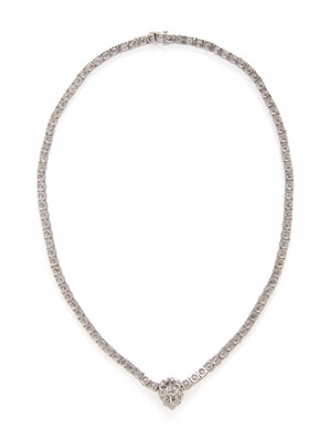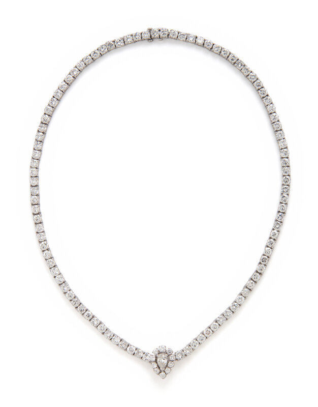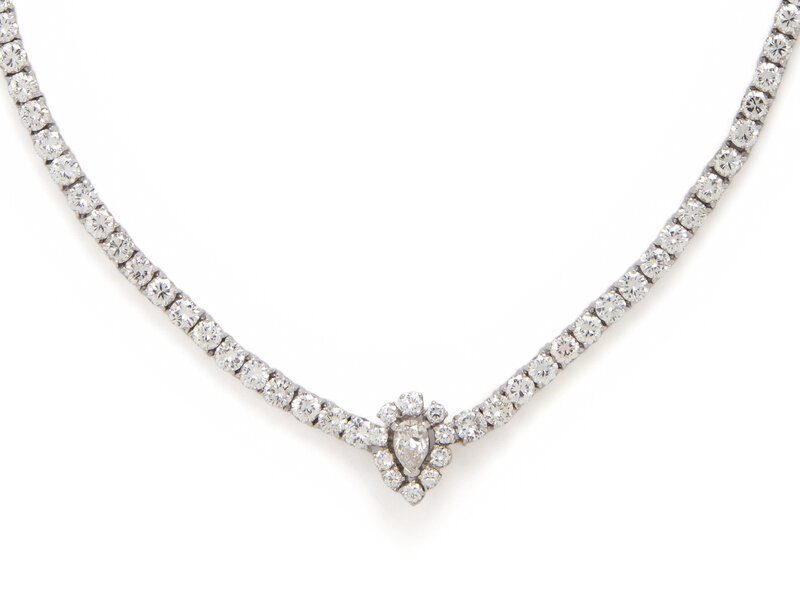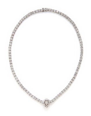 Round brilliant cut diamond line necklace, weighing approximately 18.00 - 21.00 carats total, centered by a pear shaped diamond weighing approximately 0.60 carat, with round brilliant cut diamond surround. Mounted in platinum. 15 1/2 inches long.