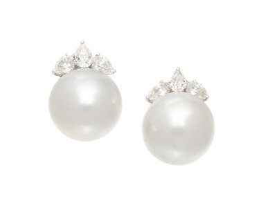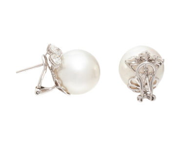 Featuring cultured pearls measuring approximately 15.00 mm, with pear shaped diamond trefoil clusters weighing approximately 1.80 carats total. Mounted in 18 karat white gold. 3/4 inch long.