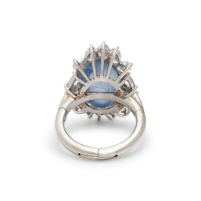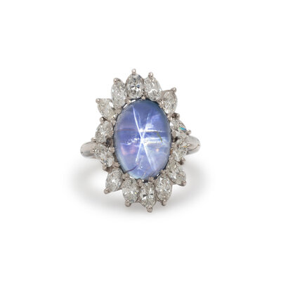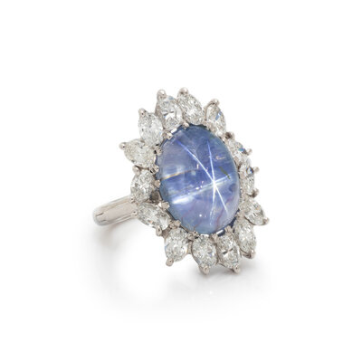 Centering a star sapphire measuring approximately 13.40 x 9.65 mm, with oval brilliant cut diamond surround weighing approximately 1.65 carats total. Mounted in platinum. Ring size 5 3/4.