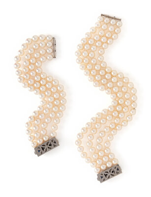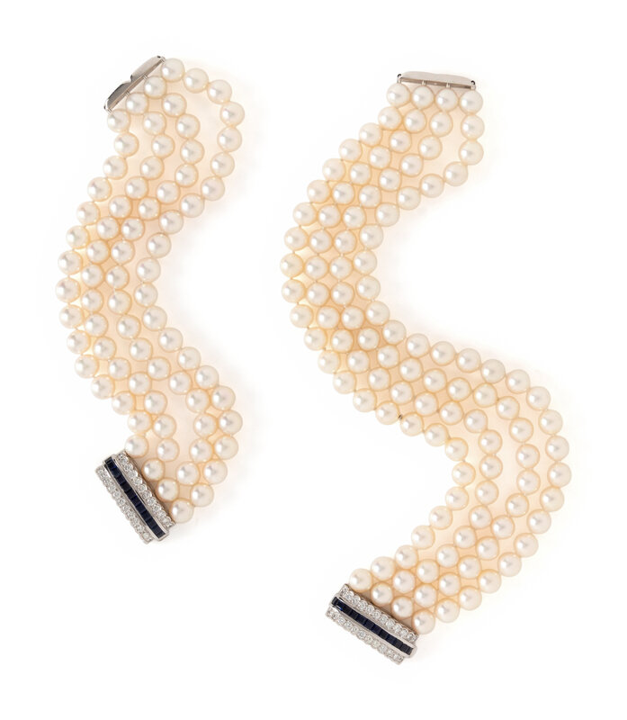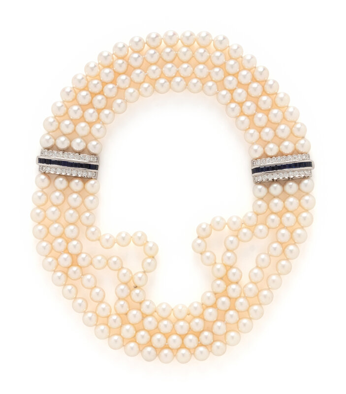 Four strands of cultured pearls measuring approximately 8.50 - 9.00 mm, with two white gold clasps set with square sapphires and round diamonds weighing approximately 3.15 carats total. When separated the necklace forms two sections: 6 inches and 10 inches long, 1 1/4 inches wide.