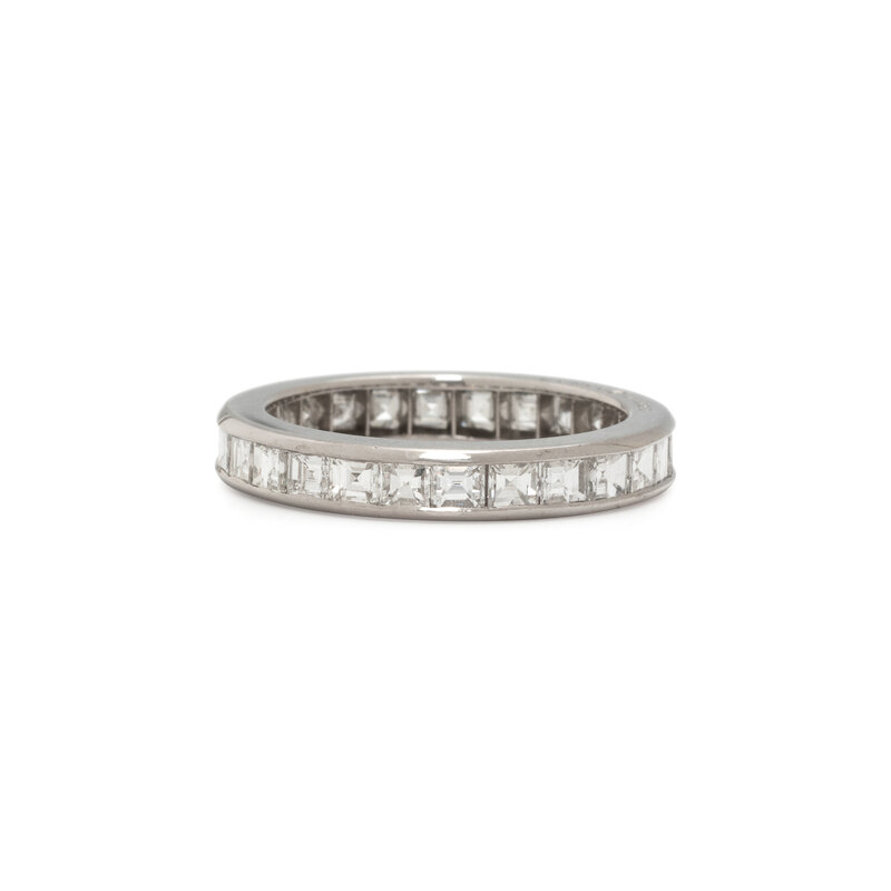 Square step cut diamonds weighing approximately 2.60 carats total, channel-set in platinum. Ring size 7 1/2.