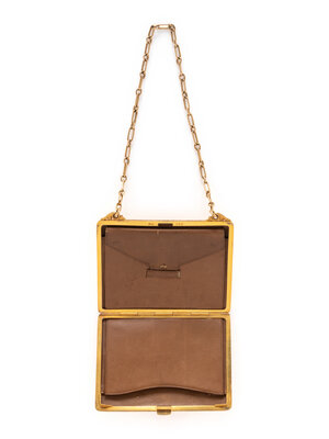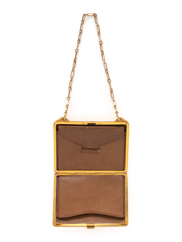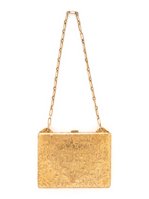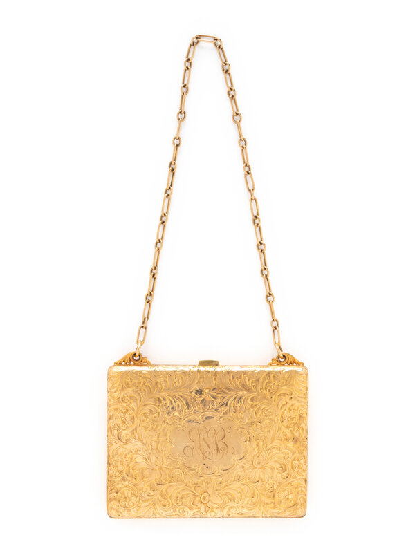 With a delicately engraved case featuring a foliate pattern and a monogram on the front, and two brown leather compartments on the interior. 14 karat yellow gold. 3 1/2 x 2 5/8 x 1/2 inch. Handle drop: 5 3/4 inches.