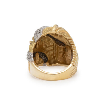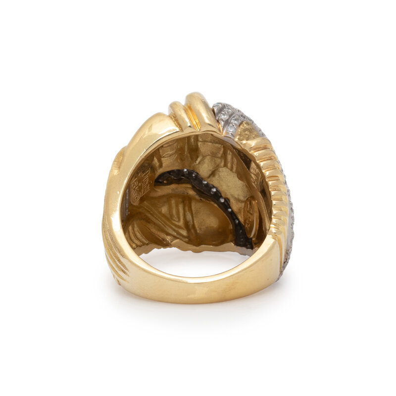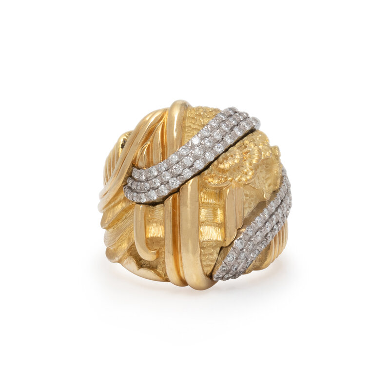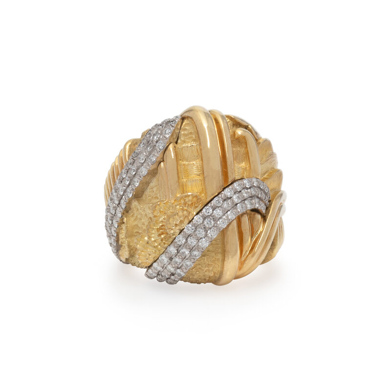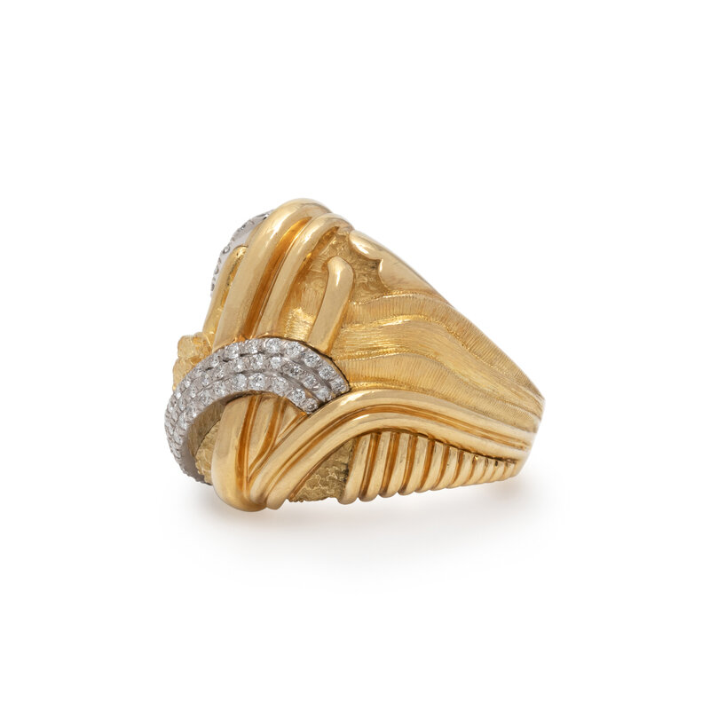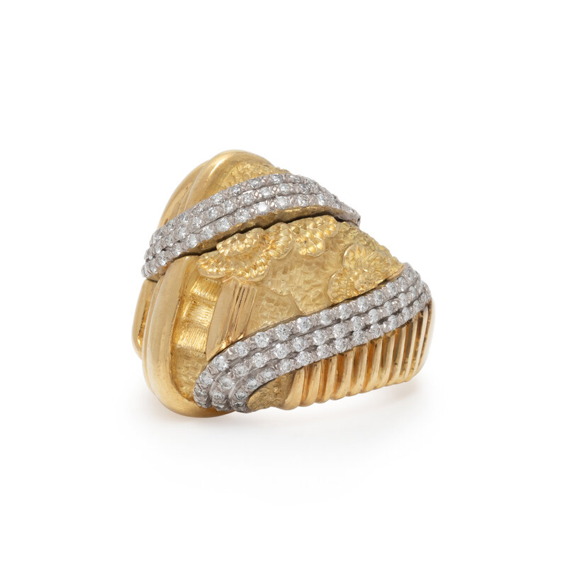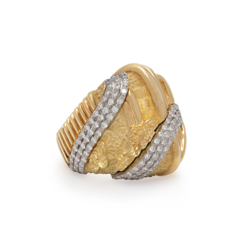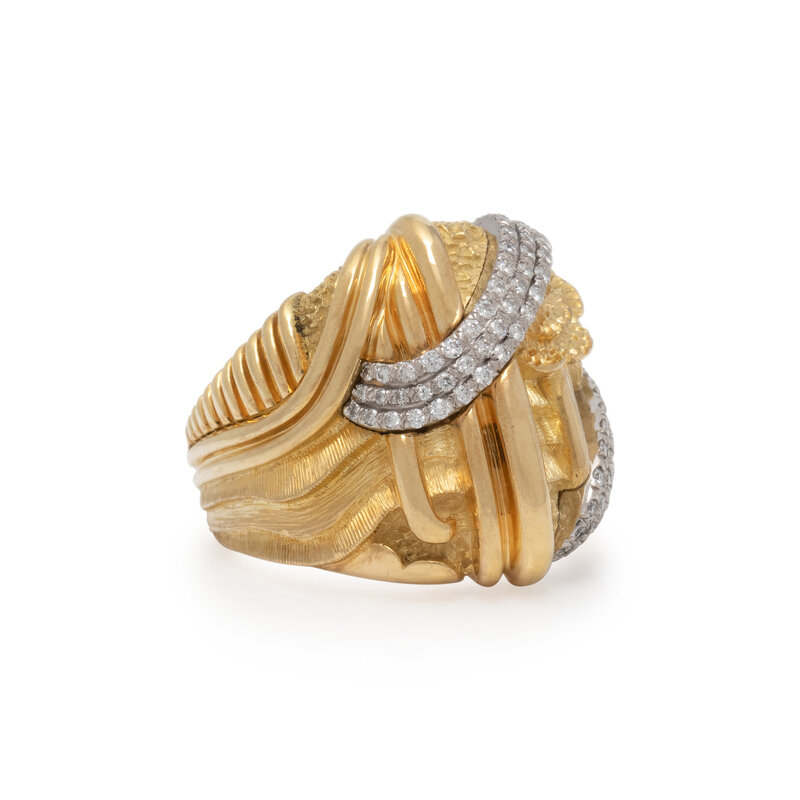 In a variously textured design, with swirls of round diamonds. 18 karat yellow gold and platinum. Ring size 7.