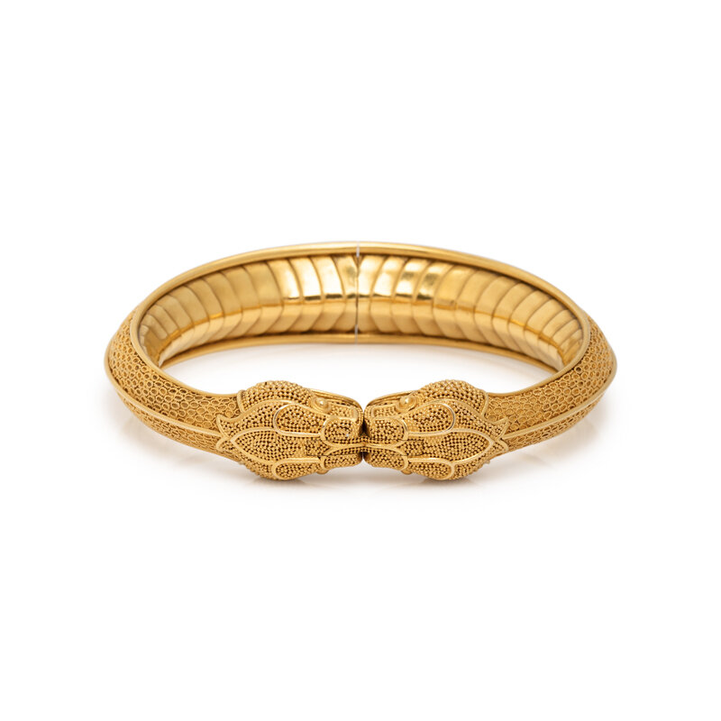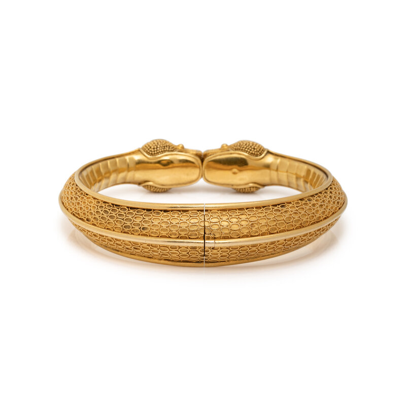 Designed as two serpent heads with fine granulation extending to the hinged body with wirework details and a hinged hidden clasp. High karat gold. 6 1/2 inches inner circumference.