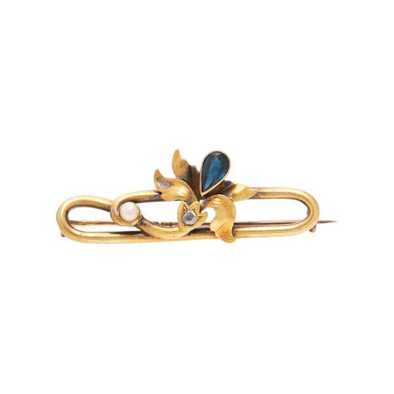 In a delicate twisting design, depicting a flower set with a pear shaped sapphire weighing approximately 0.50 carat total, accented by a rose cut diamond and a pearl. Mounted in 14 karat gold. 1 3/4 x 5/8 inches.