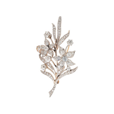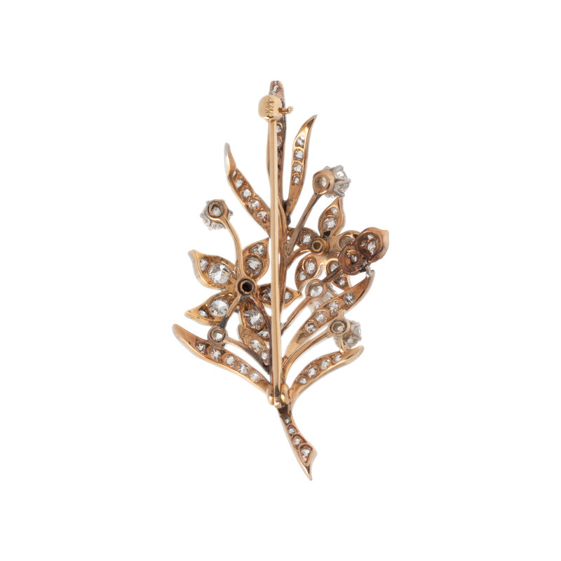 Set with old mine, old European, and single cut diamonds weighing approximately 3.00 carats total. Mounted in platinum-topped gold. 2 inches long.