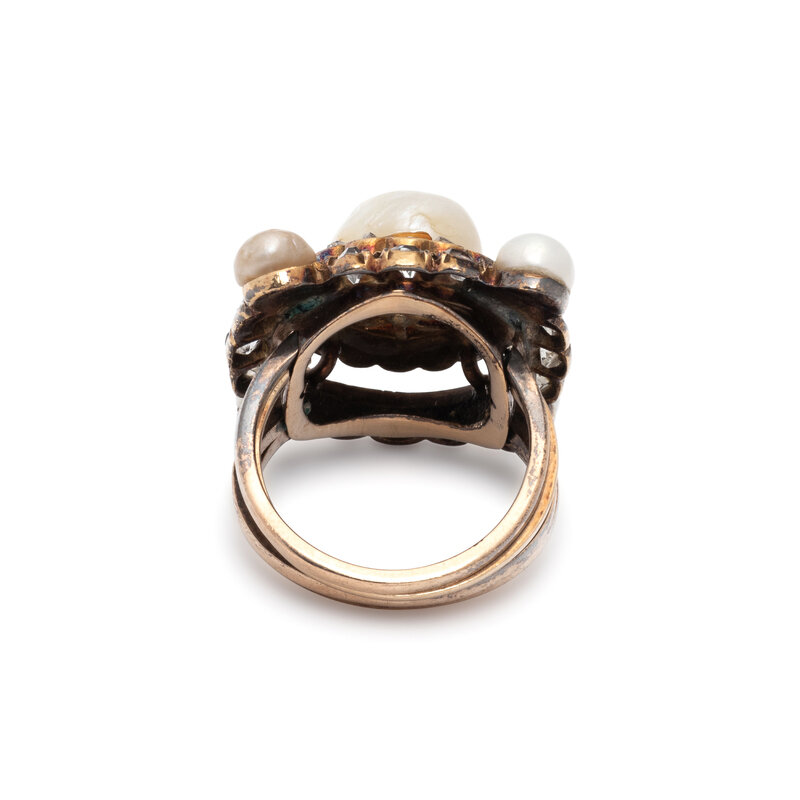 Set with a natural pearl measuring approximately 10.45 x 10.03 mm, accented by rose and old mine cut diamonds, and pearls (not tested for natural or cultured) measuring approximately 5.00 - 5.35 mm. Mounted in yellow gold. Ring size 6 1/4.