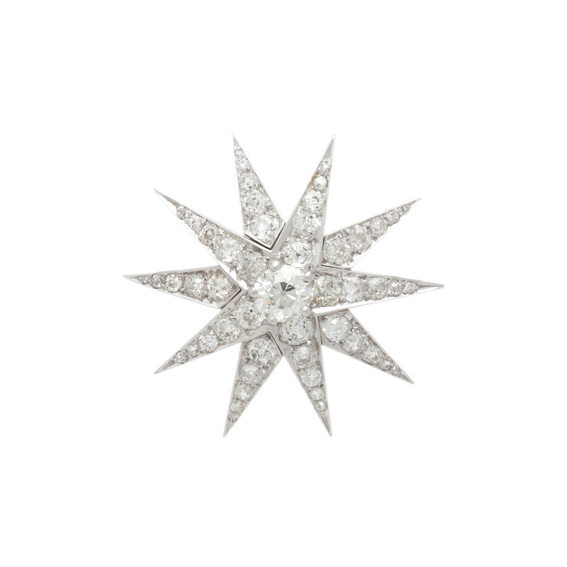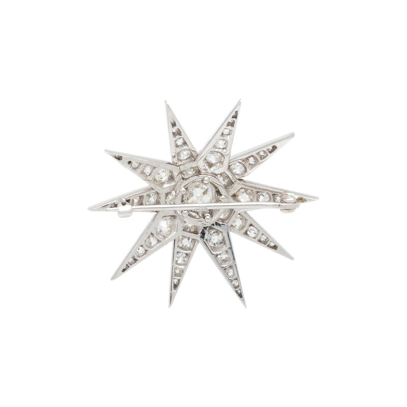The center set with an old European cut diamond weighing approximately 1.20 carats by formula, with additional old European cut diamonds weighing approximately 3.50 - 3.50 carats total set in the rays. Mounted in platinum. 1 1/2 inches wide.