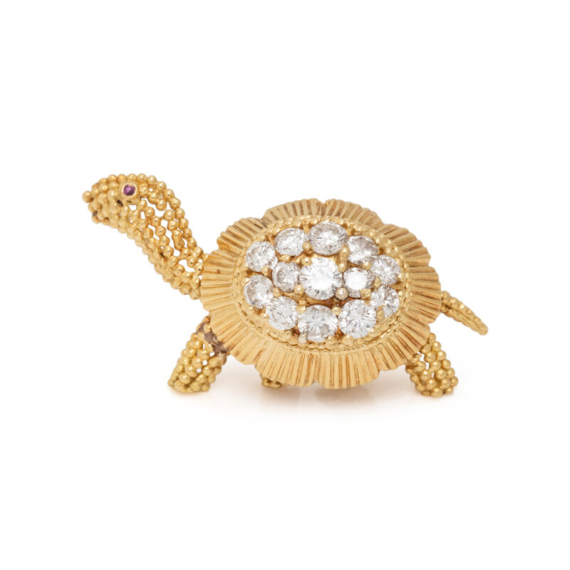 Designed as a turtle, the shell set with round diamonds weighing approximately 1.50 carats total, and one ruby eye. 1 3/8 inches x 5/8 inch.