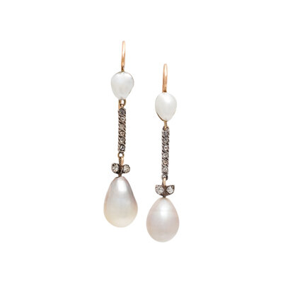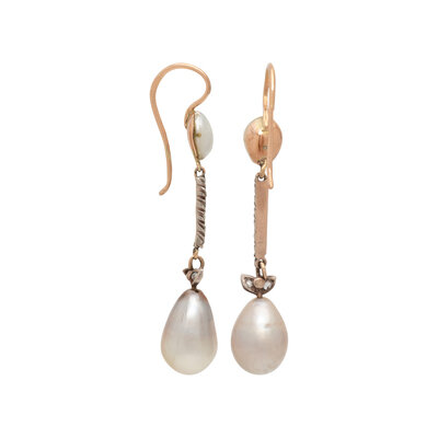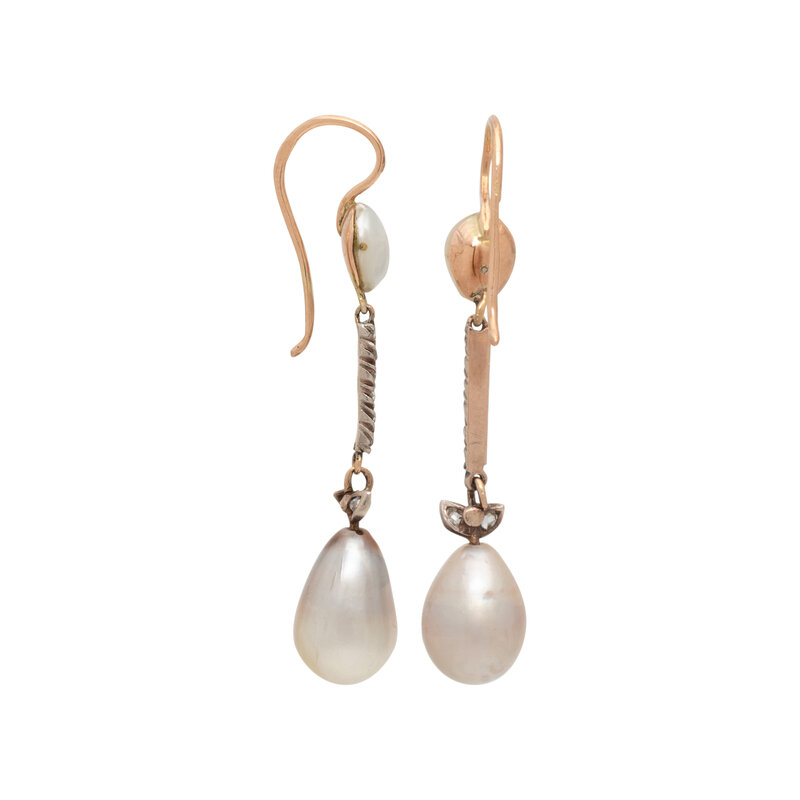 RUSSIAN, NATURAL PEARL AND DIAMOND EARRINGS