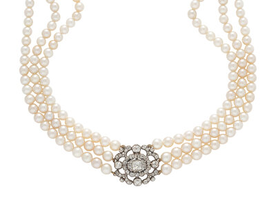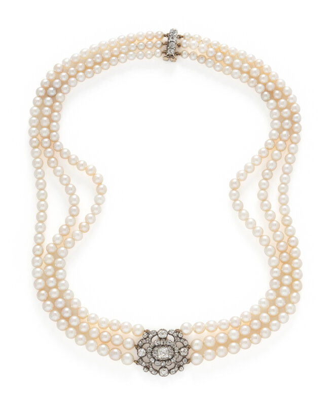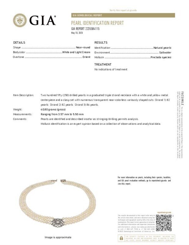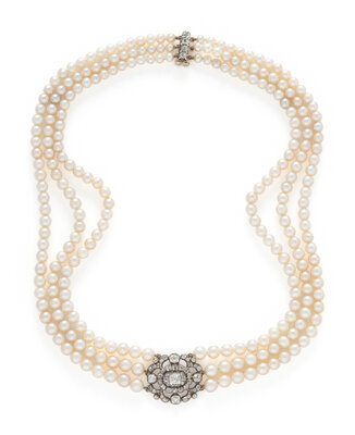 Three strands of graduating natural pearls measuring approximately 3.57 - 5.50 mm, with silver-topped gold clasp and central motif set with old mine cut diamonds weighing approximately 2.00 carats total. 15 1/4 inches long.