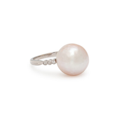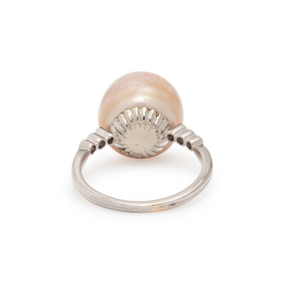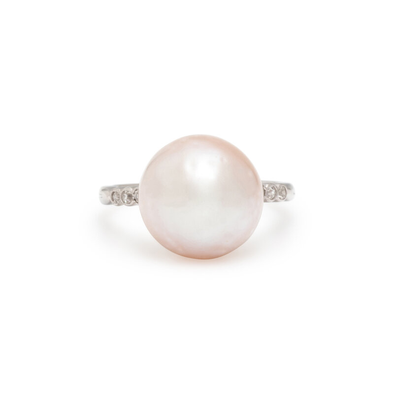 Featuring a natural pearl measuring 12.21 x 11.95 x 10.57 mm, with single cut diamond shoulders. Mounted in platinum. Ring size 5 1/2.