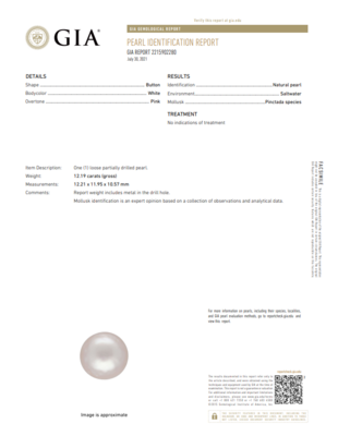 GIA, 2021, Report No. 2215902280, Natural pearl, Saltwater environment, Pinctada species mollusk, No indications of treatment