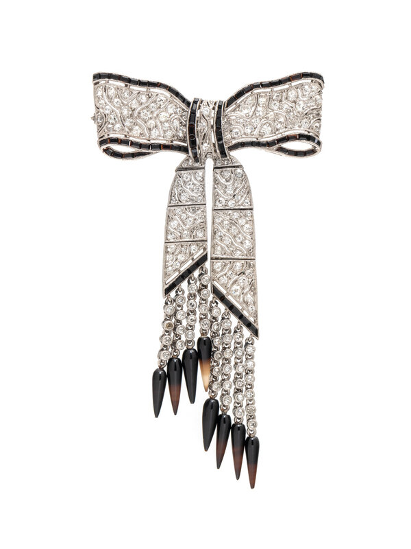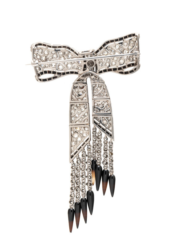 Designed as a pierced platinum bow set with old mine and single cut diamonds and trimmed with calibré cut black onyx, the articulated ribbon suspending single cut diamond collets with agate fringe. Diamonds weighing approximately 2.50-3.00 carats total. Mounted in platinum. 3 x 1 3/4 inches.