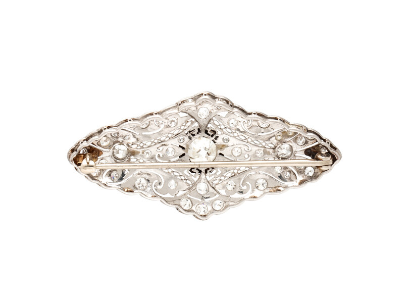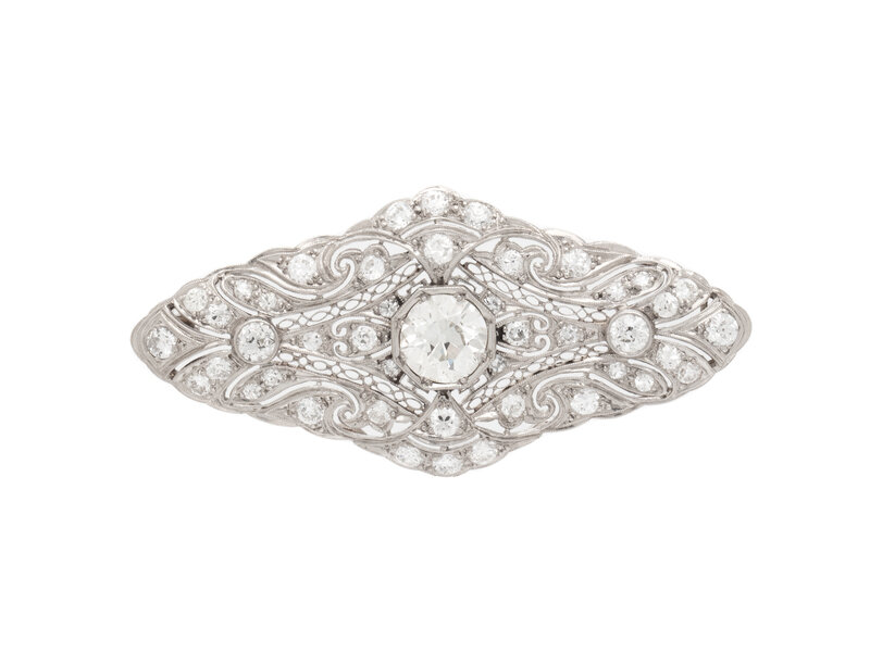 With delicate openwork millegrain design, centering an old European cut diamond weighing approximately 1.70 carats total, with bead and collet-set old European and single cut accent diamonds throughout weighing approximately 2.20 carats total. Mounted in platinum. 2 1/8 x 1 inches.