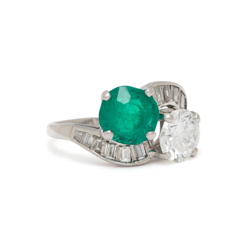Featuring a round brilliant cut diamond weighing 1.89 carats, and a round mixed cut emerald weighing approximately 2.50 carats by formula, with baguette cut diamond set shoulders. Mounted in platinum. Ring size 6 1/2.