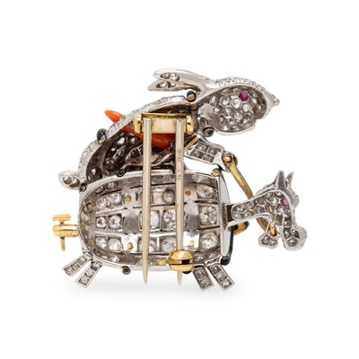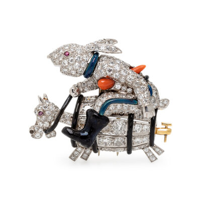 The whimsical design of a rabbit clutching a coral 'carrot' and riding a barrel horse, set with old European and single cut diamonds weighing approximately 3.00 carats total, with enamel details. Platinum and 18 karat yellow gold. 1 1/4 x 1 1/4 inches.