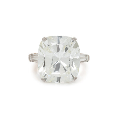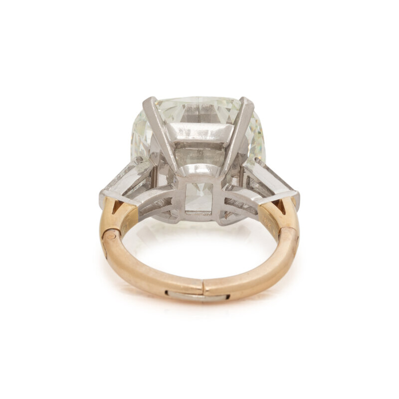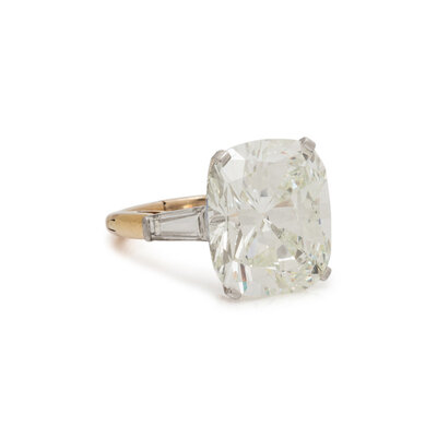 Centering a cushion brilliant cut diamond weighing 14.45 carats, flanked by two tapered baguette cut diamonds. Mounted in platinum and 18 karat yellow gold. Ring size 5 1/4.