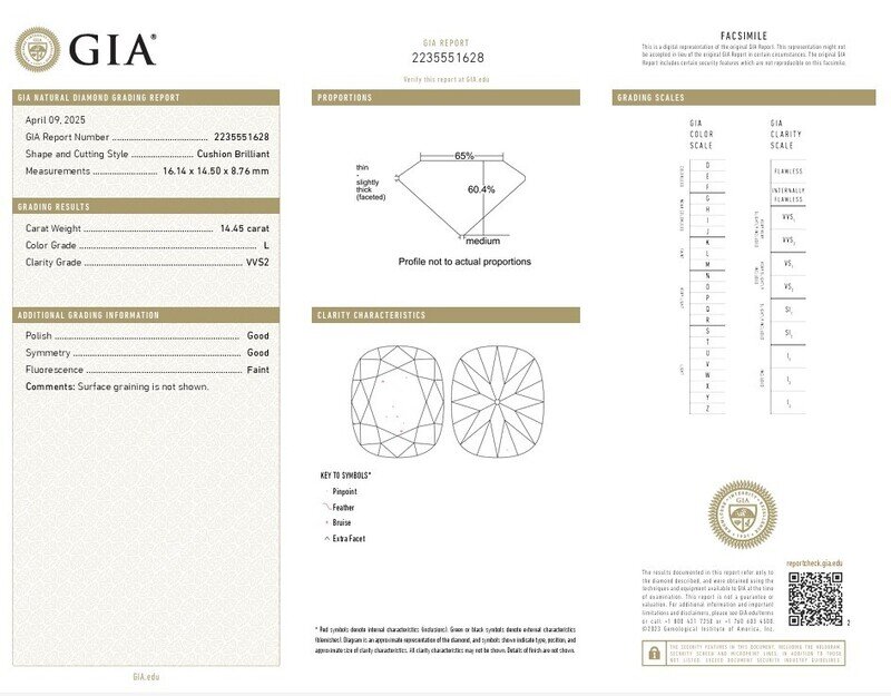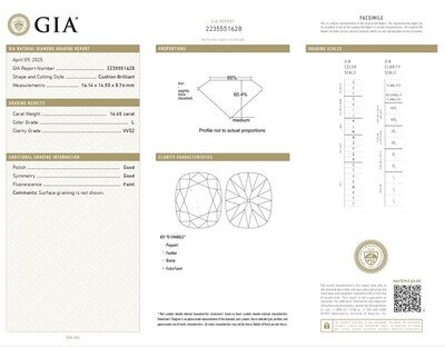 GIA, 2025, Report No. 2235551628, 14.45 carats, L color, VVS2 clarity, Faint fluorescence