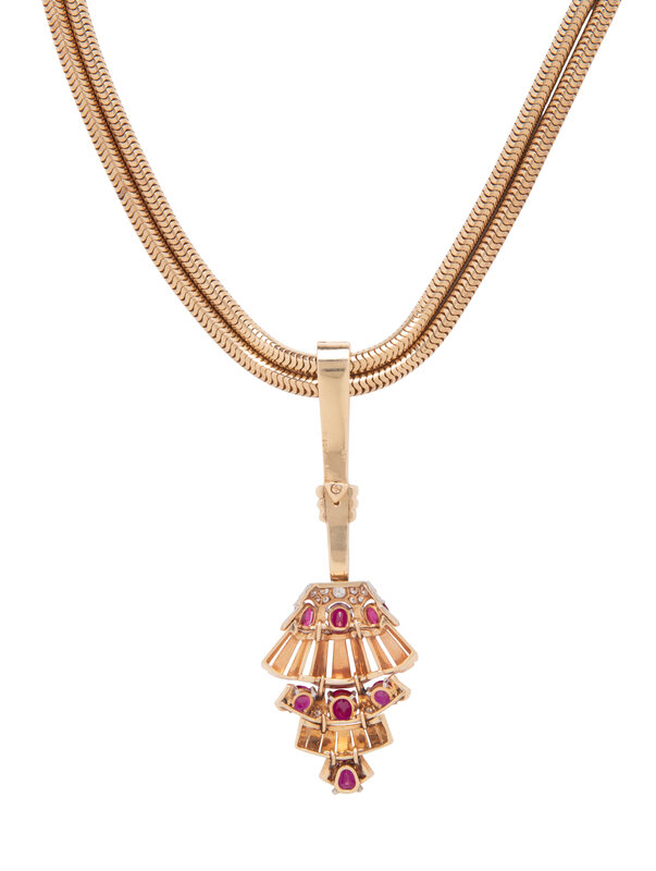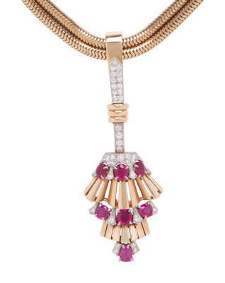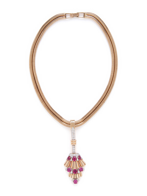 TIFFANY & CO., RETRO, RUBY AND DIAMOND PENDANT WITH GOLD CHAIN