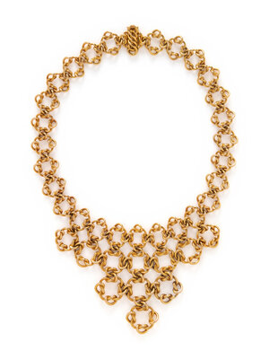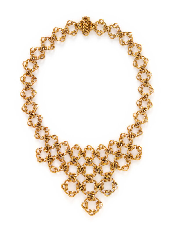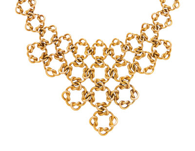 The fancy links forming a bib. 18 karat yellow gold. 14 3/4 inches long.