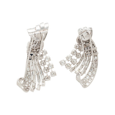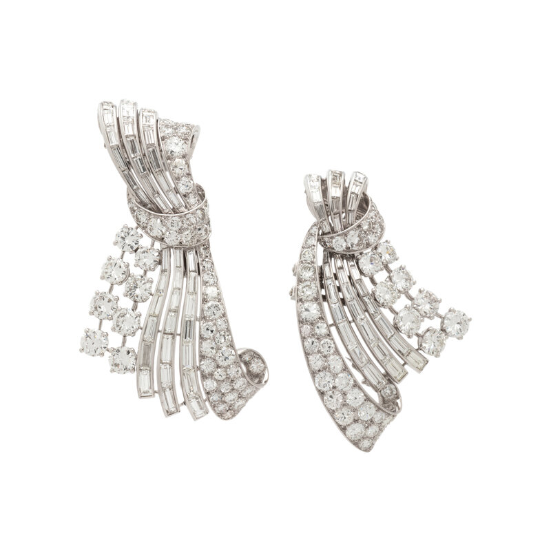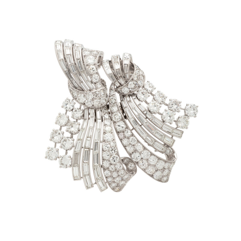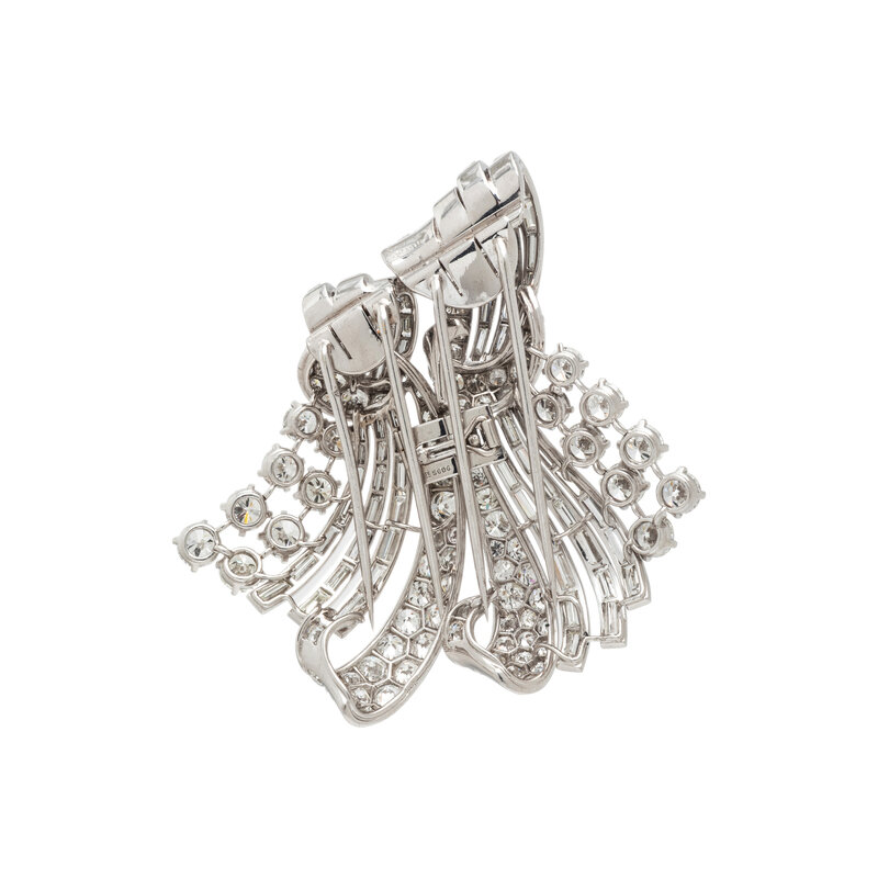 Designed as a pair of ribbon motif scrolls, set with round brilliant and baguette cut diamonds weighing approximately 16.00 - 17.00 carats total, can be detached from the frame for wear as two clips. Mounted in platinum and white gold. 2 x 2 inches.