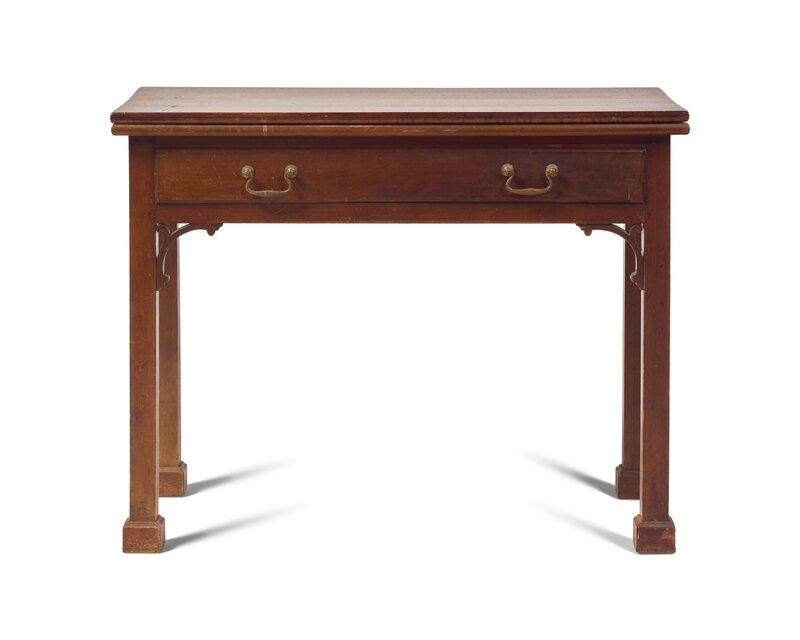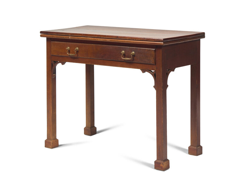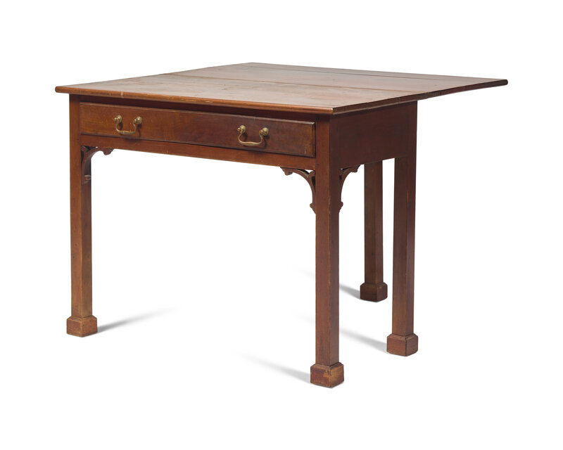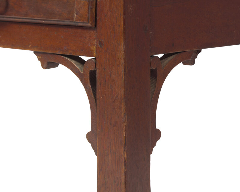 with flat rectangular top, over single drawer, with carved brackets, on straight Marlborough legs ending in block feet.