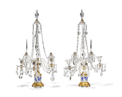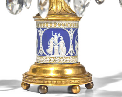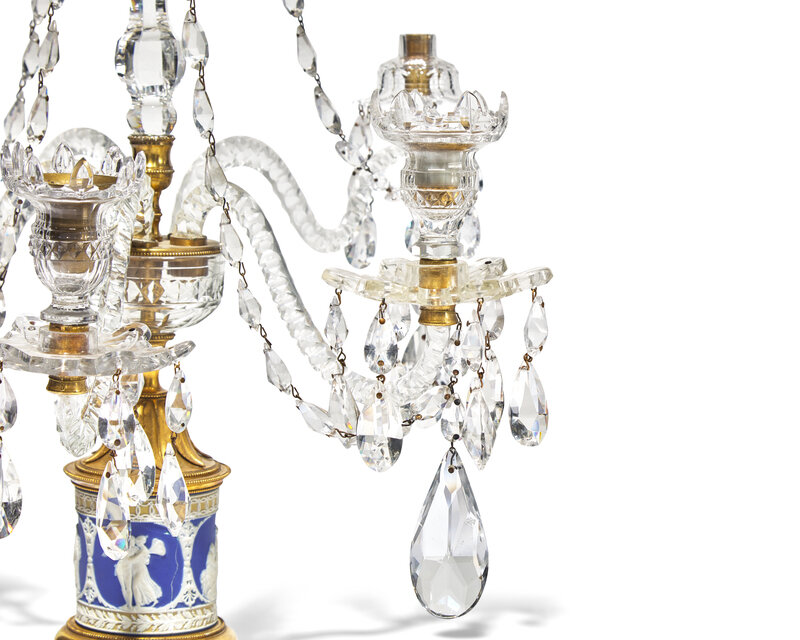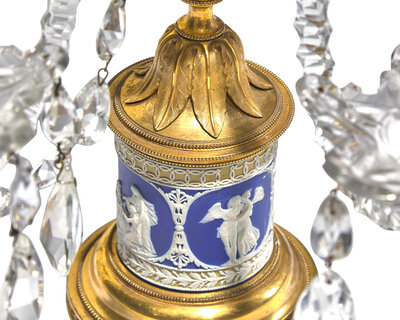 A Pair of George III Neoclassical Colorless Cut-Glass, Jasperware, and Gilt-Metal Girandoles
