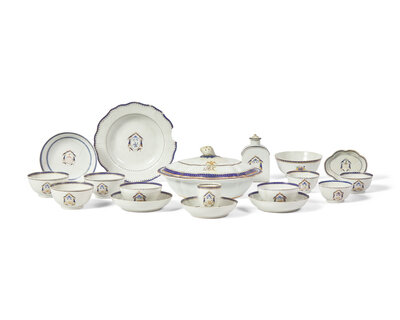 the majority decorated with be-ribboned shield-form reserve flanked by swagged drapery, containing various monograms; comprising a covered vegetable tureen, bearing eagle with monogram, "FS"; a soup plate; a small dish with crest in the form of an a raised arm holding scepter and bearing monogram, "RW"; four tea bowls, a teacup, and saucer bearing monogram, "RCS"; a spoon rest with crest in the form of a crown issuing serpent and bearing monogram, "ME"; a tea caddy bearing monogram, "RAB"; a small bowl with shield bearing monogram, "GD," surrounded by crest in the form of two rearing lions with crossed laurel branch and liberty pole and surmounted by cornucopia; a pair of tea bowls and saucers bearing monogram, "JW"; and two tea bowls, bearing monograms, "Y", "AS"; each with red-painted accession number, "1969.112."