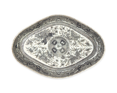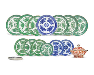 comprising a sauce boat underplate in black, circa 1820; a covered sauce tureen in orange; six dinner plates, two dessert plates, a dish, and a saucer in green; and a souple plate and two dessert plates in blue, the soup plate with monogram, "WMB"; some bearing accession numbers, "90.18", "86.50", and "88.14."