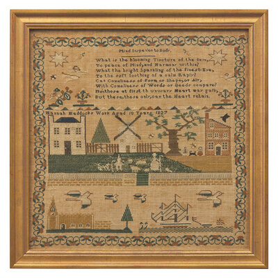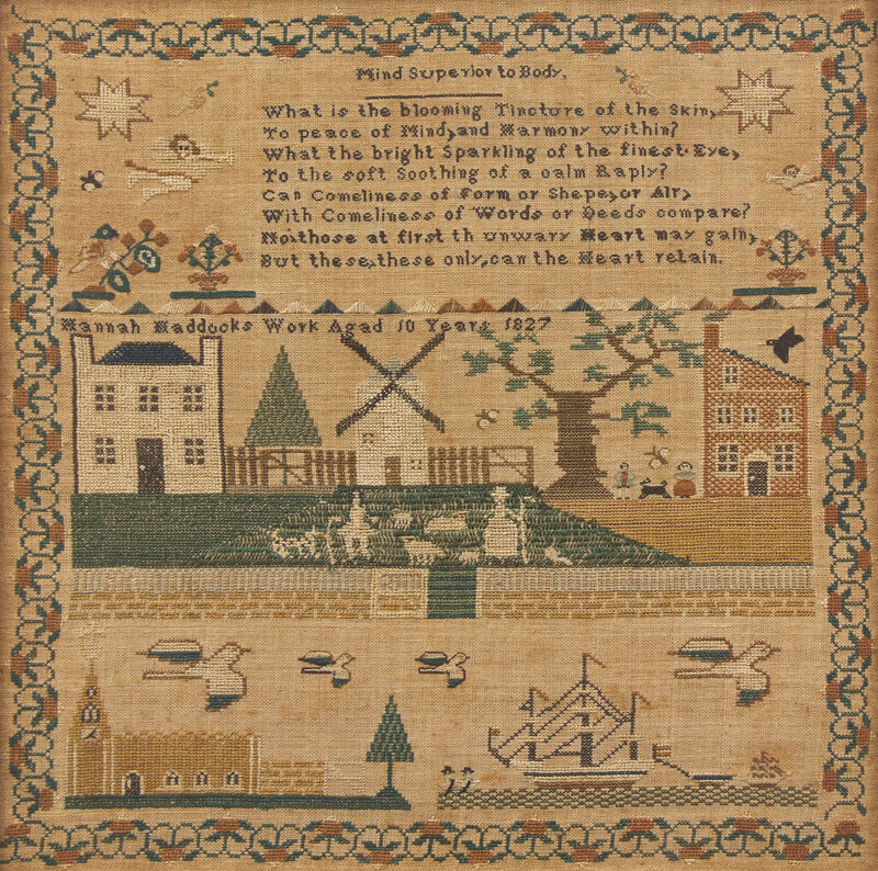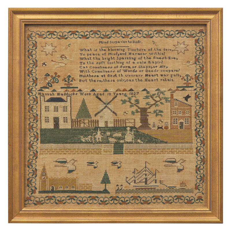 inscribed, "Hannah Maddocks Work Aged 10 Years 1827," worked with polychrome silk threads on a linen ground, framed.