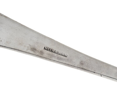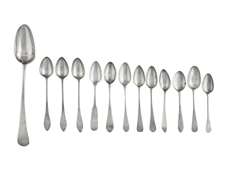 comprising a set of three bird-back teaspoons by David Hall (1767-1814), Lancaster, Pennsylvania, circa 1795, with drops at bowl backs, pointed ends, engraved with with monogram, "AB," marked to undersides; a bird-back teaspoon by William Haverstick (1756-1823), Philadelphia and Lancaster, Pennsylvania, circa 1795, with drop at bowl back, pointed end, engraved with monogram, "EB," marked to underside; a fiddle-back teaspoon by Joseph Shoemaker (1765-1829), Philadelphia, Pennsylvania, circa 1810, engraved with monogram, "A," the underside of handle engraved, "C. Hackett," marked; a teaspoon by Jacob Perkins (1766-1849), Newburyport, Massachusetts, circa 1780, with drop at bowl back, engraved with monogram, "SS," marked to underside; a bird-back teaspoon by William Bradford Whiting (1731-1796), Norwich, Connecticut, circa 1780, with drop at bowl back, engraved with monogram, "HB," marked to underside; a coffin-end teaspoon by Nicholas Geffroy (c. 1761-1839), Newport, Rhode Island, circa 1800, with bright-cut decoration and engraved with monogram, "SB," marked to underside of handle; a teaspoon by Samuel Casey (1724-after 1770), Exeter, Rhode Island, circa 1770, with drop at bowl back, engraved with monogram, "W/ IM," marked to underside of handle; a teaspoon by Joseph Clark (1764-1821), Danbury, Connecticut, circa 1785, with shell and drop at bowl back, engraved with monogram, "C," marked to underside; a teaspoon by Brazillai Davison (1739-1828), Norwich, Connecticut, circa 1765, with drop at bowl back, engraved with monogram, "MH," marked to underside; and a teaspoon probably by Benjamin Hurd (1739-1781), Boston, Massachusetts, circa 1770, with drop at bowl back, engraved with monogram, "HI," marked to underside; together with a silver tablespoon by Nathaniel Coleman (1765-1842), Burlington, New Jersey, circa 1790, with drop at bowl back, engraved with monogram, "JPC," marked to underside of handle.