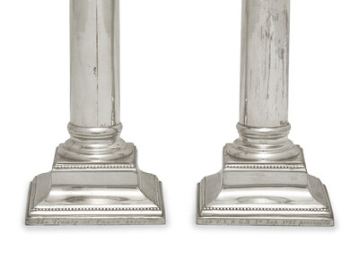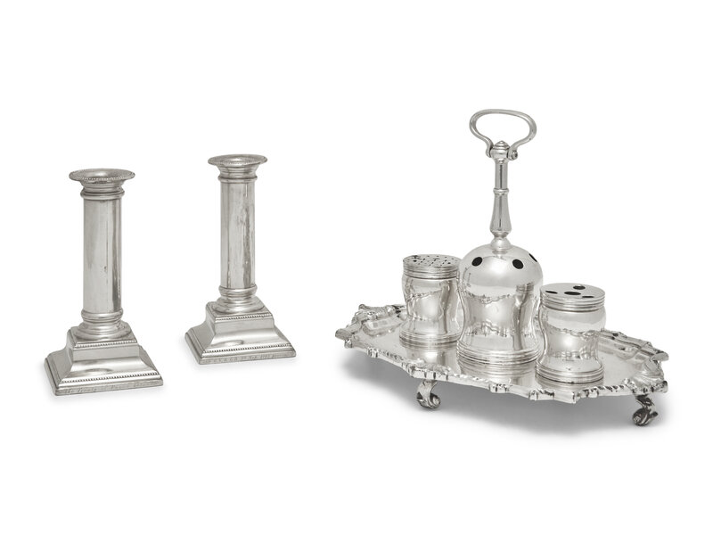 A Reproduction Silver-Plated Inkstand and a Pair of Reproduction Sterling Silver Candlesticks