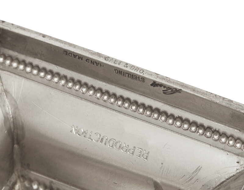 comprising a silver-plated inkstand after the 1752 original by Philip Syng, Jr. (1703-1789), Philadelphia, Pennsylvania, which was used during the signing of Declaration of Independence in 1776, bearing accession number, "77.31"; and a pair of sterling silver candlesticks after the originals used at the Treaty of Paris in 1783, engraved to bases, "Used at the Seating of the Treaty of Peace between the U.S. and G.B. 3d Sep. 1783 presented by Ann Jay to Sarah Dawson," marked to underside, bearing accession number, "70.82."