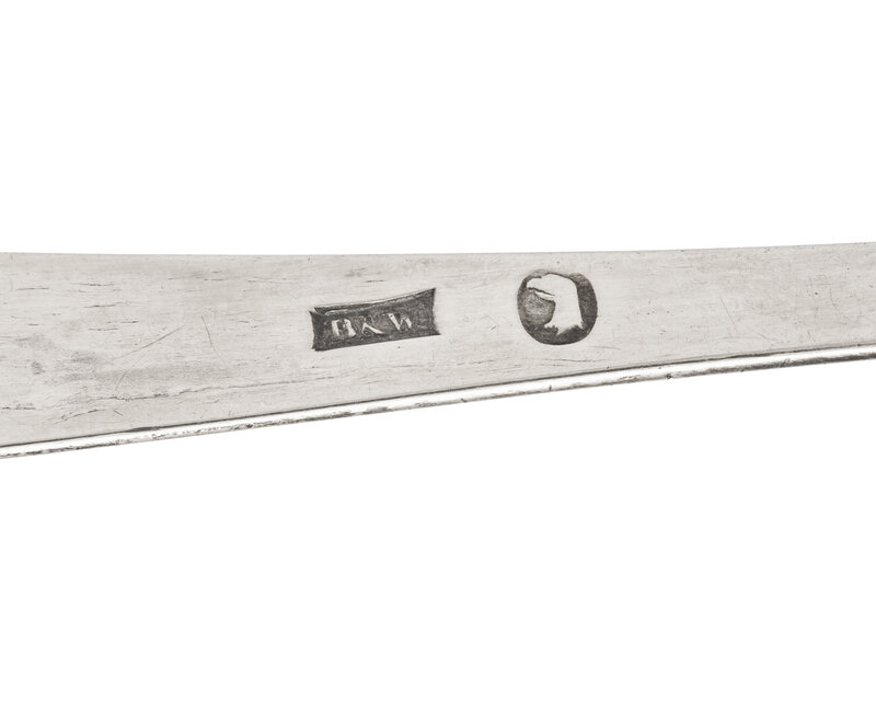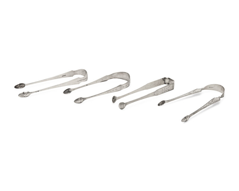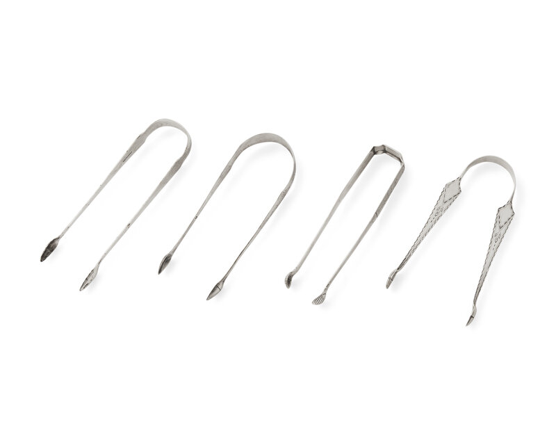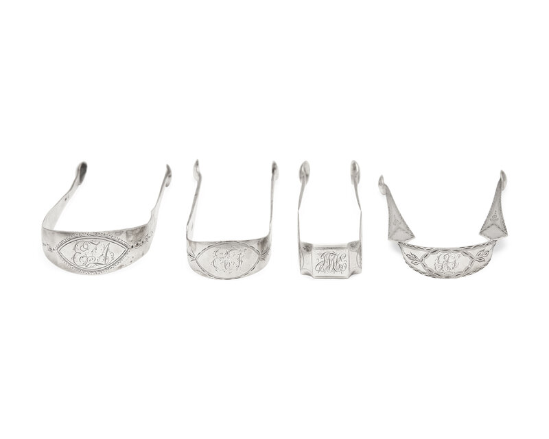 comprising sugar tongs, by maker "I. Rice," with acorn-form bowls, engraved with navette-form cartouche bearing monogram, "GCS," marked; a sugar tongs, by "W&W" (?), with acorn-form bowls, engraved with navette-form cartouche bearing monogram, "ELA," marked; a sugar tongs, by William Haverstick (1756-1823), Sr. or William Haverstick, Jr. (1780-1859), Lancaster or Philadelphia, Pennsylvania, circa 1805, the sides engraved with flowering tulips, bearing monogram, "JMK," marked; and a sugar tongs, by "T. Milne" and "S. White," with acorn-form bowls, engraved with navette-form cartouche bearing monogram, "EF," marked.