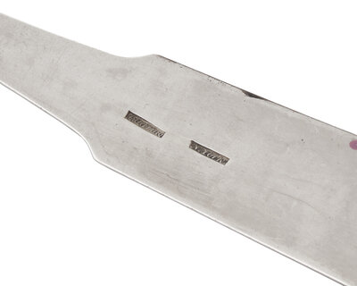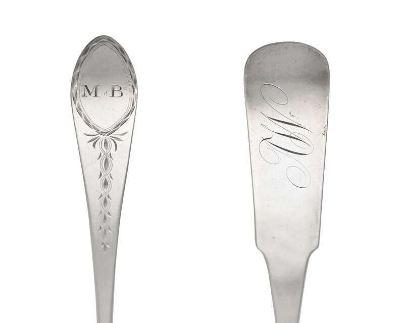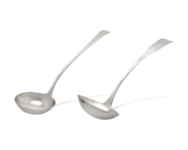 the first, a ladle by John Sayre, circa 1795, with pointed end and bright-cut decoration including navette-form cartouche bearing monogram, "M*B," marked; the second, a ladle by Christopher Giffing, circa 1815, with fiddle end, and engraved with monogram, "AW," marked; both bearing accession numbers, "86.16" and "91.31", respectively.
