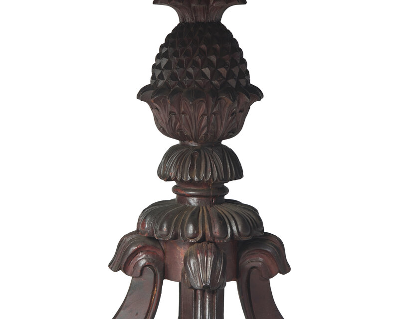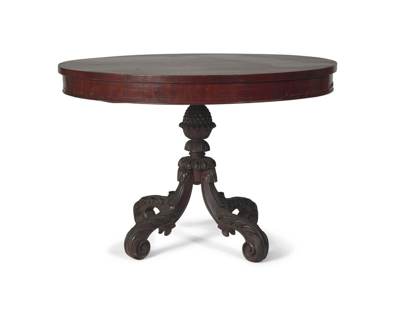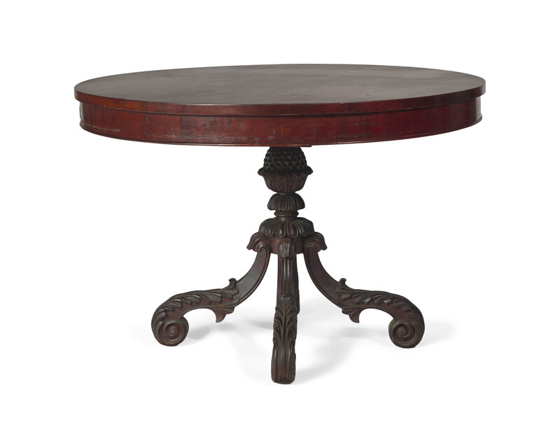 round top, on boldly carved base with pineapple support on four scrolled legs with carved acanthus leaves.