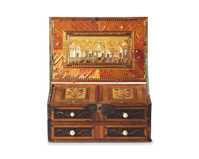 decorated with floral motifs and townscapes, with lid revealing interior lidded compartments over a single drawer.