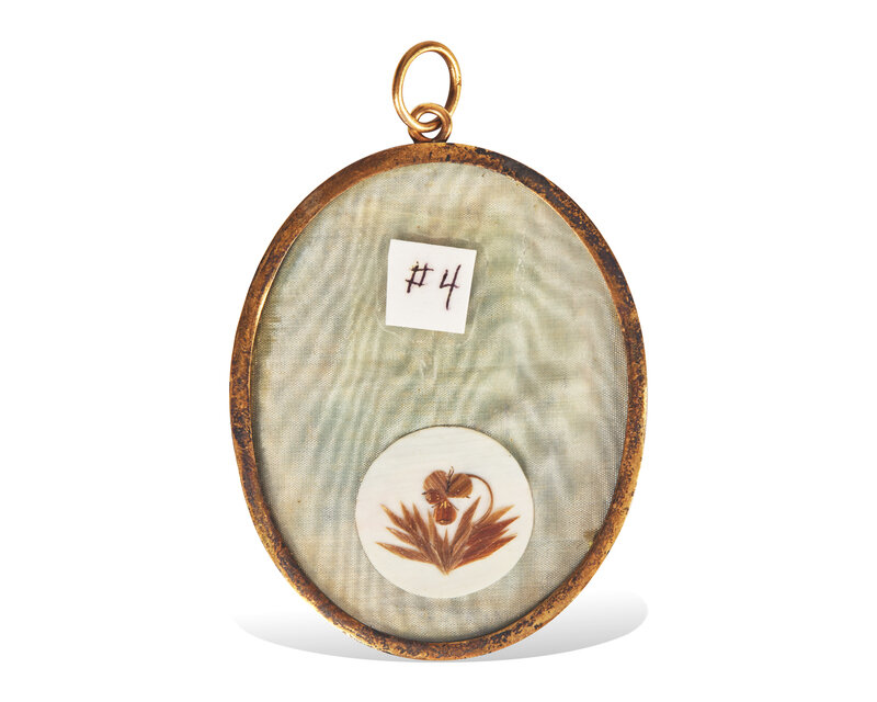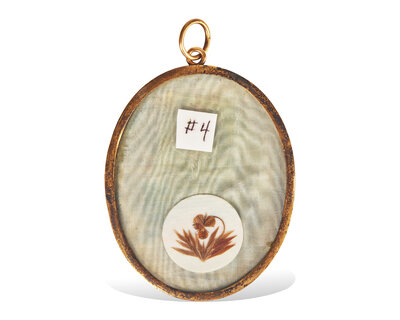 signed, "Labroue," l.r., watercolor, verso with green moire silk backing applied with roundel of hairwork floral spray, housed in gilt metal pendant case.
