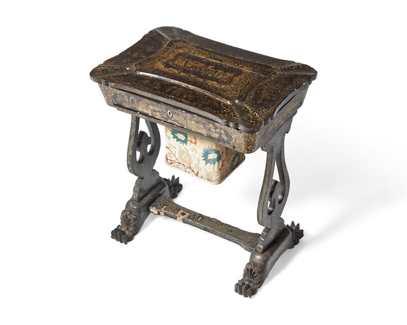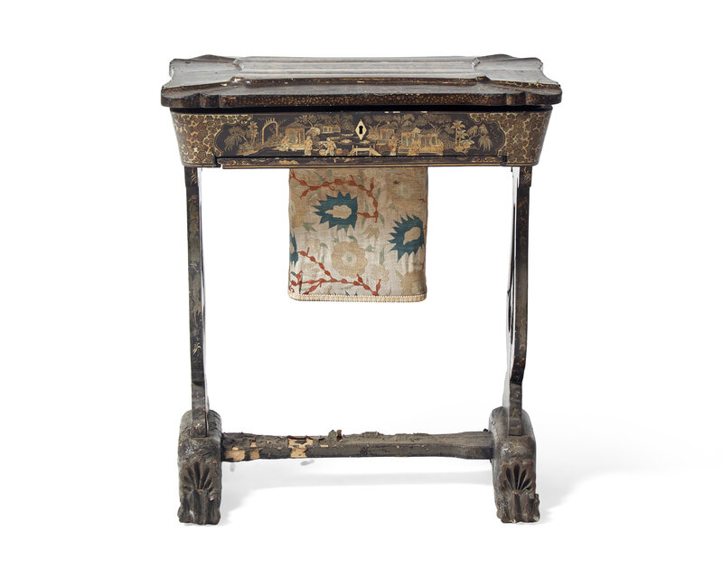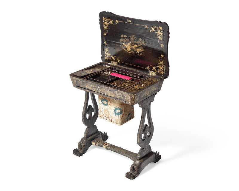 the lift-lid top revealing sewing compartments, with embroidered needlework fabric bin, on shell and paw-form feet.
