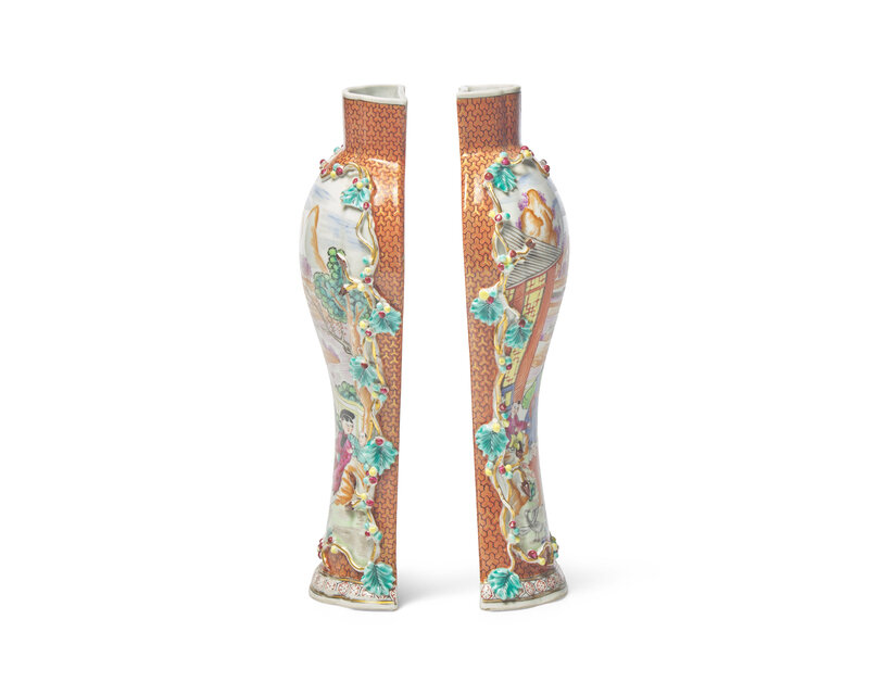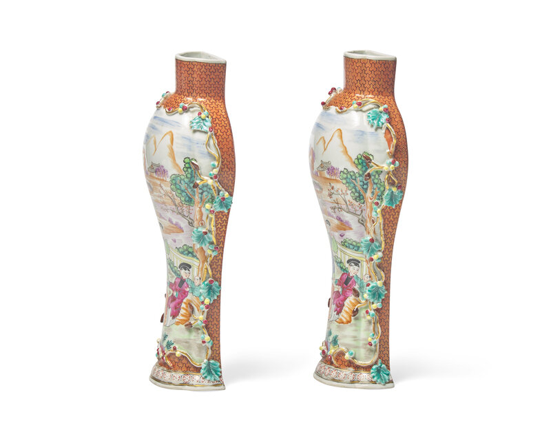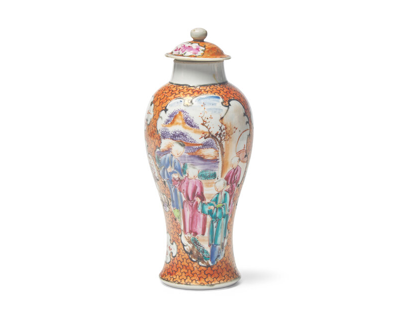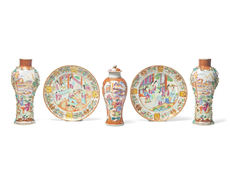 comprising two plates and a covered baluster vase; sold together with a pair of Chinese Export style porcelain wall pocket vases in the Rose Mandarin palette, 19th / 20th century.