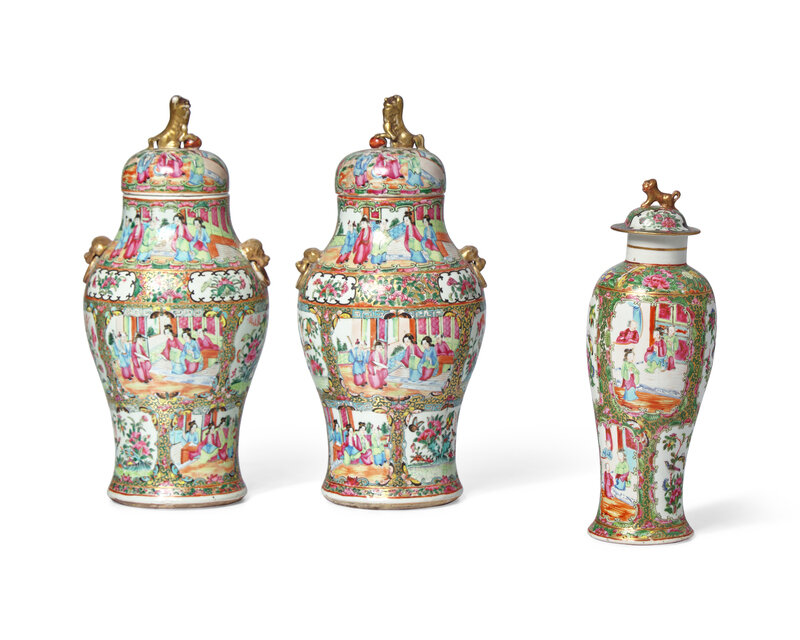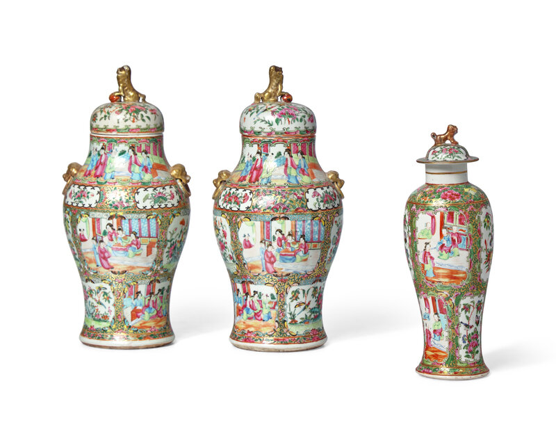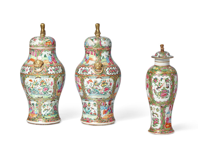 Three Chinese Export Porcelain Rose Medallion Covered Vases