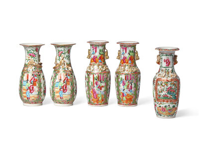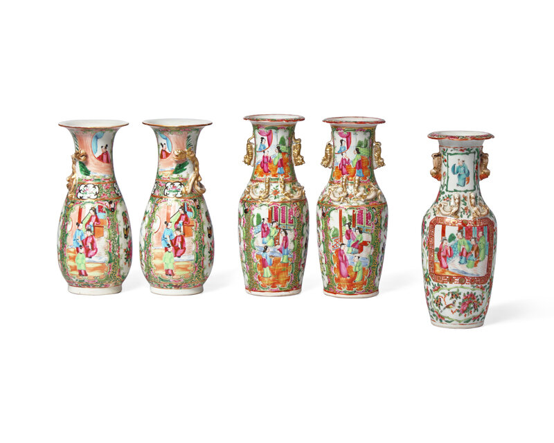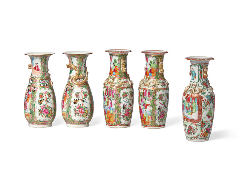 Five Chinese Export Porcelain Rose Medallion Vases