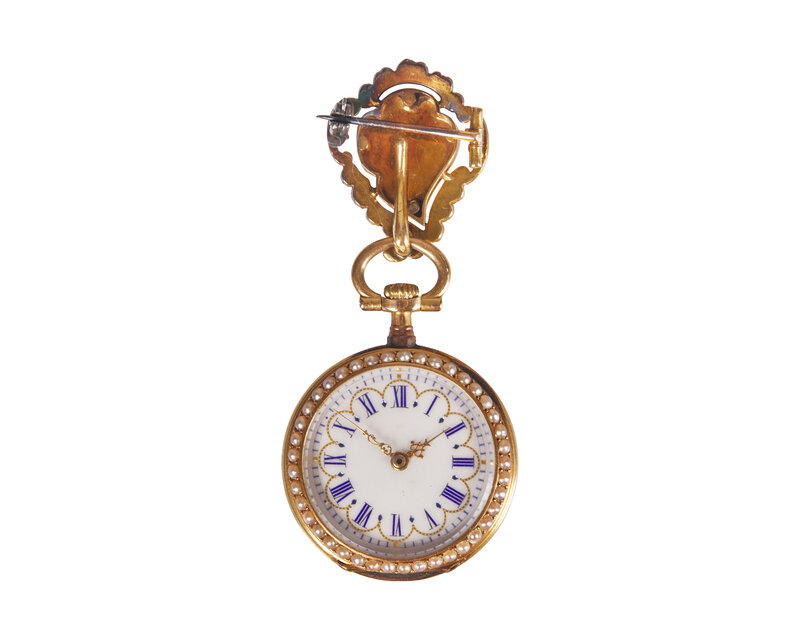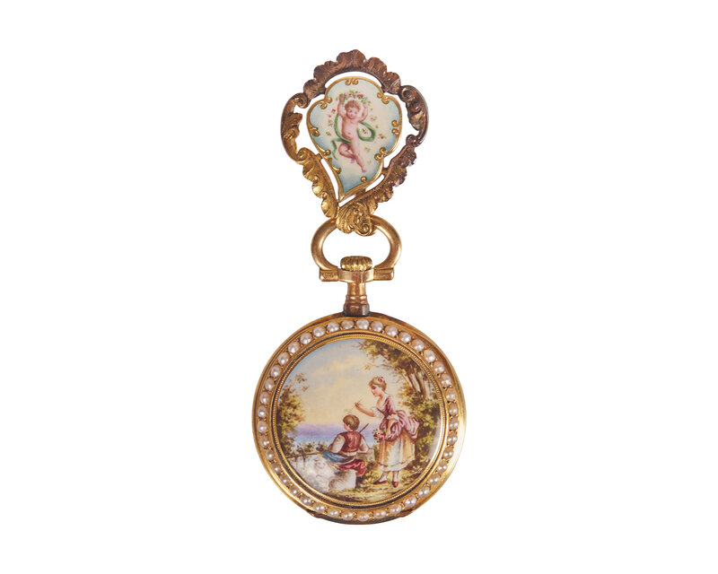 with enamel dial, the reverse with enamel painted pastoral scene depicting a shepherd and shepherdess, with seed pearl surround, the loop with pendant brooch inset with enamel painted plaque with putto, interior marked.