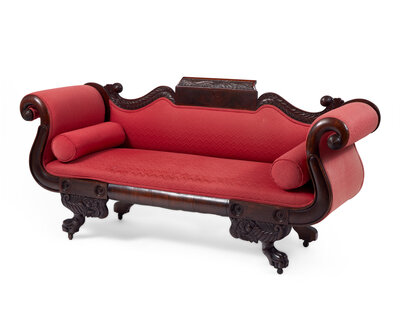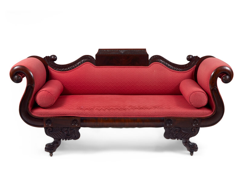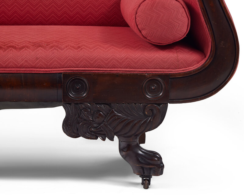 with shaped crest-rail with central frieze carved with acanthus, scrolled arms, on cornucopia and paw-form feet with brass casters.