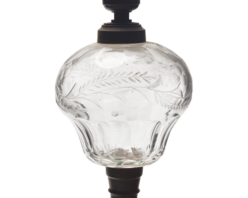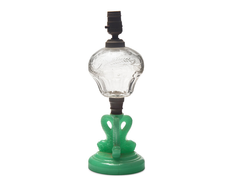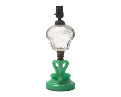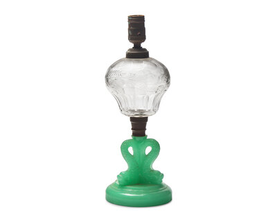 A Pressed Jade Green and Etched Clear Glass Kerosene Lamp